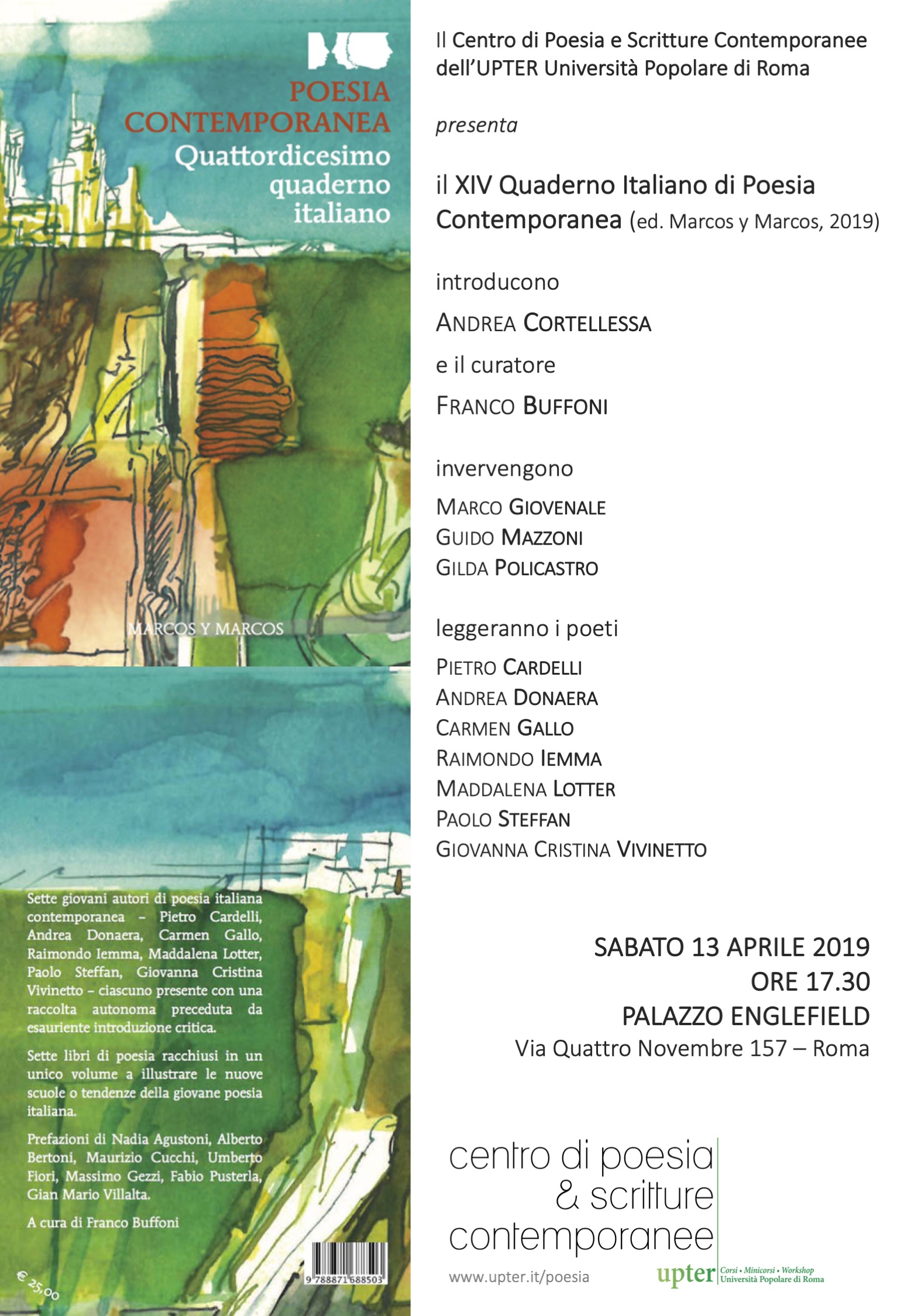 Sabato 13 aprile, Roma, Upter – Università popolare di Roma, h. 17.00. Con Franco Buffoni, Andrea Cortellessa, Gilda Policastro, Marco Giovenale, Guido Mazzoni.