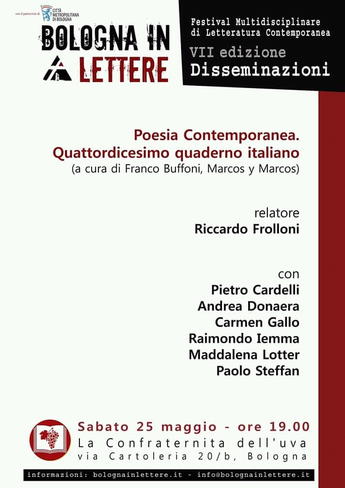Sabato 25 maggio, Bologna, Libreria cafè wine bar “La confraternita dell’uva”, nell’ambito del festival ‘Bologna in lettere‘. Con Riccardo Frolloni.