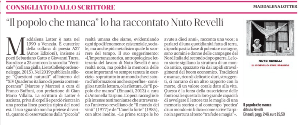 Per la rubrica “Consigliato dallo scrittore” di Mary Barbara Tolusso, Trieste, Il Piccolo, 12/4/2020