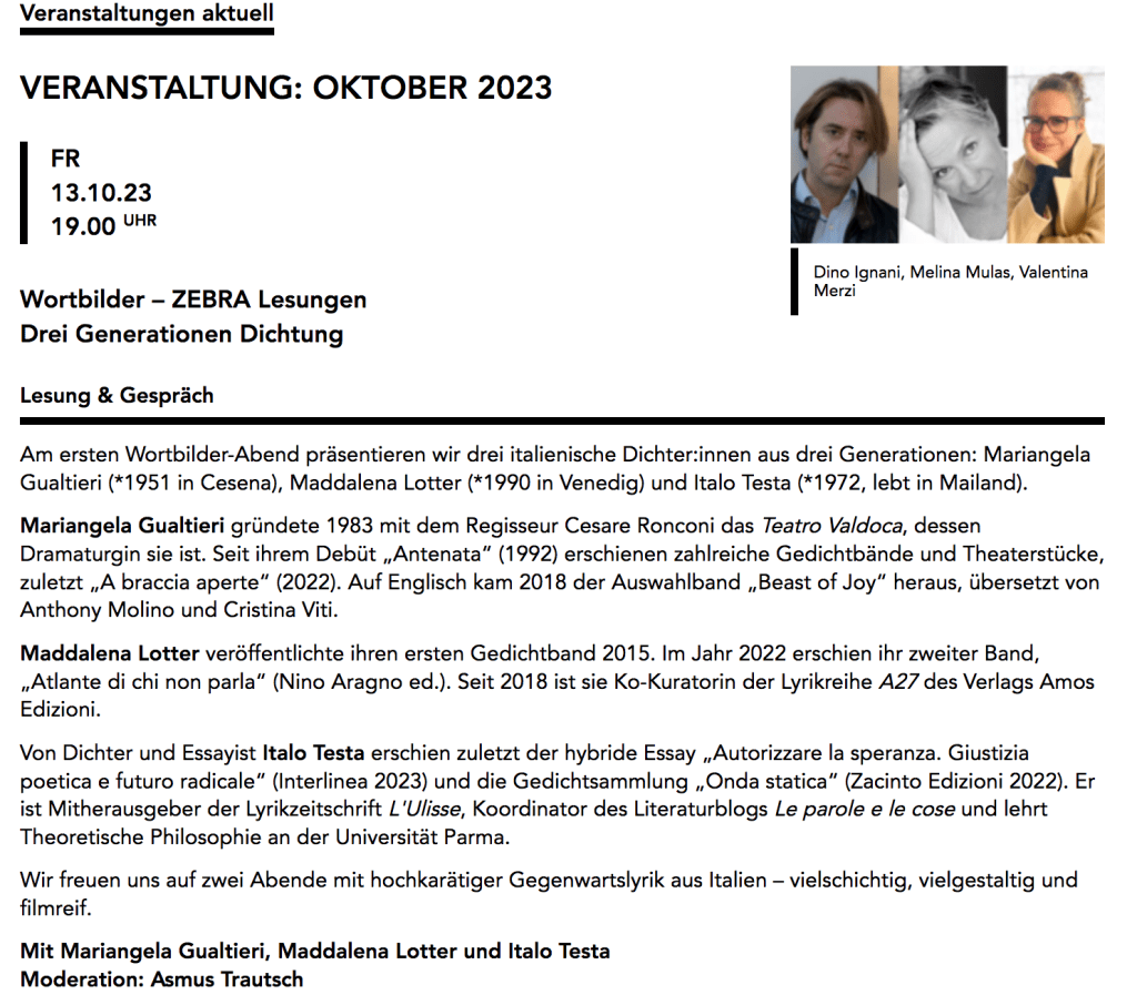 E’ stato molto bello partecipare alla lettura alla Haus für Poesie di Berlino, insieme a Italo Testa e Mariangela Gualtieri. Grazie a tutto lo staff dello Zebra poetry film festival per l’invito!