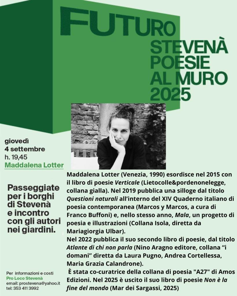 Festa di Poesia: 1 luglio, ore 21.00 con i poeti Giovanna Frene, Pasquale di Palmo, Julian Zhara, Maddalena Lotter, Piero Simon Ostan, Lino Roncali, Silvio Ornella.